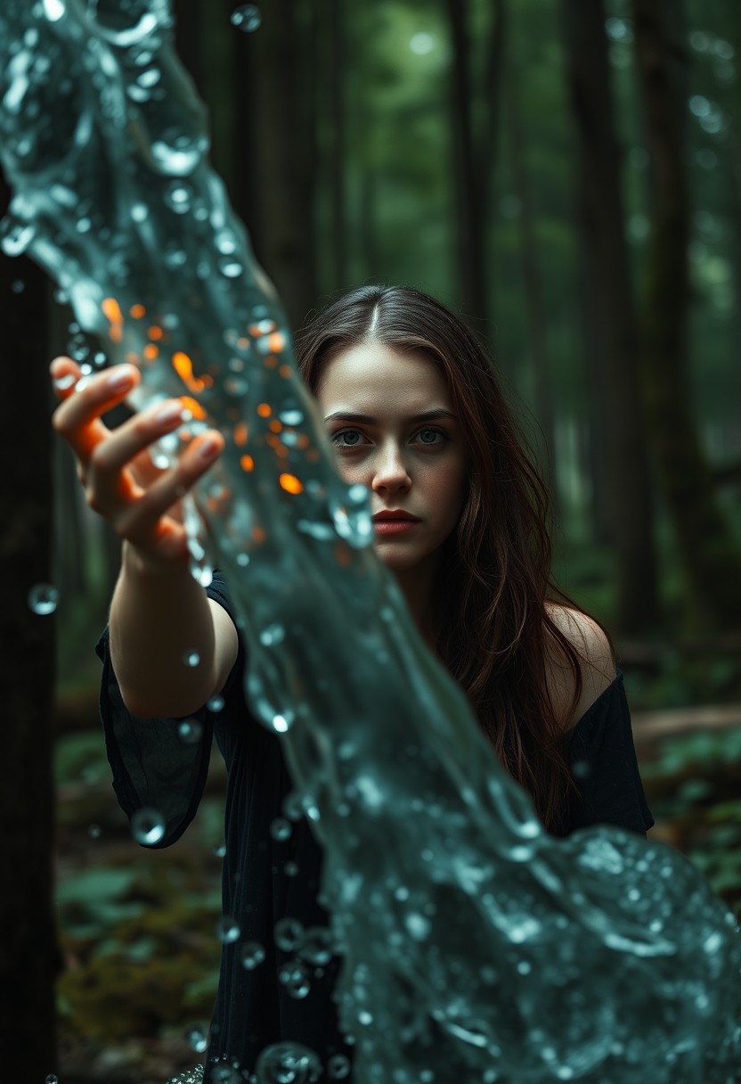 A 35-year-old European girl in the forest uses water magic, horror, dark forest, controls a large flow of water, an evil focused look into the frame