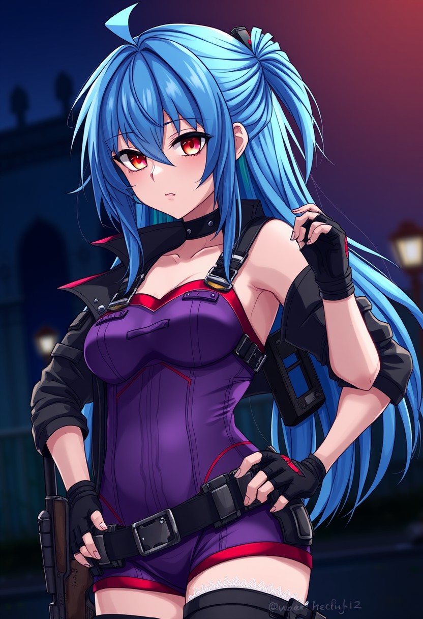 1girl,blue hairs, green inner hair, long messy hair, red eyes, cyberpunk style, tactical jacket, cowboy shot, tactical clothes, purple leotard with red trim, tactical breast armor, detached sleeves, fingerless gloves, gun holster belt,, garter straps, kneesocks,handgun, post apocalypse, outdoor, night, serious expression, studio light, (masterpiece:1.2), (best quality:1.2), (very aesthetic:1.2), (absurdres:1.2), (simple background:1.2),newest, intricate details,perfect anatomy, anime style,