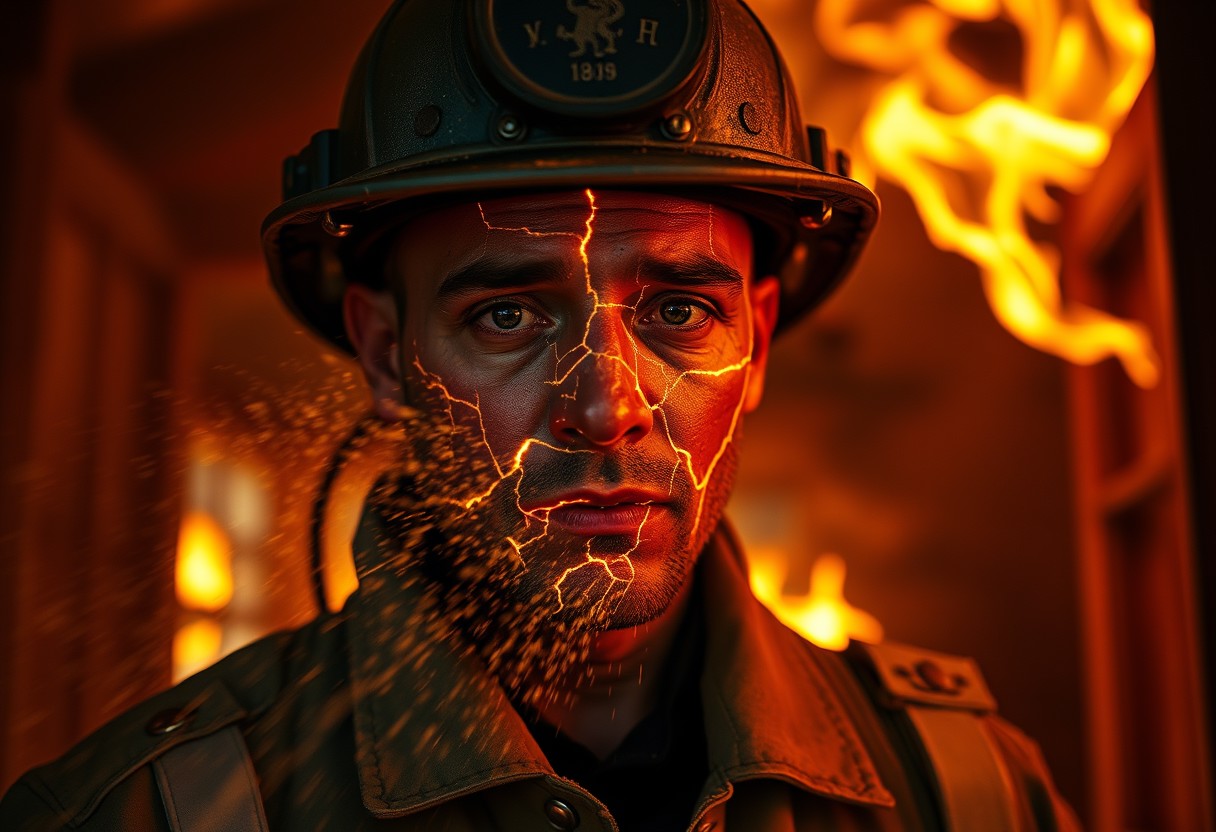 Fantasy Movie, Full body shot of Firefigher with long Cracks on face with dust particles pushing to the sides, inside burning house. Cinematic shot, motion blur, realistic, wind, action