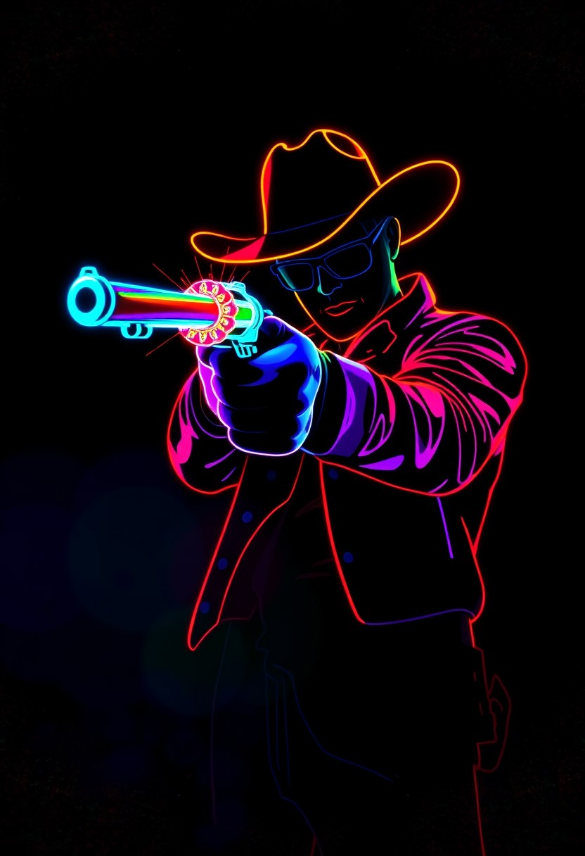 "Image of a neon outline of a cowboy, frozen in the act of shooting his pistol. The pistol's barrel is aglow with a vibrant, swirling mixture of colors, as if the bullet itself is made of pure, unadulterated color. A flurry of colors blasts from the end of the barrel, radiating outwards in a mesmerizing display of light and energy. The cowboy's neon outline is bold and striking, set against a dark background that allows the colors to pop. Style: vibrant, dynamic, and futuristic, with a focus on capturing the explosive energy and colorful chaos of the moment." Absurdres Highest-Quality, 4k