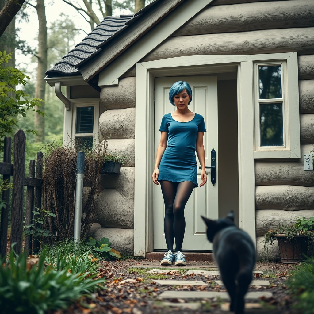high quality, 8K Ultra HD. at a woodland cottage a woman with short blue hair stands at the front door, she is wearing a blue crop top, blue mini skirt, black stockings and blue sneakers. She is looking upset as a black cat walks away from her. long shot, deep focus, eye level view