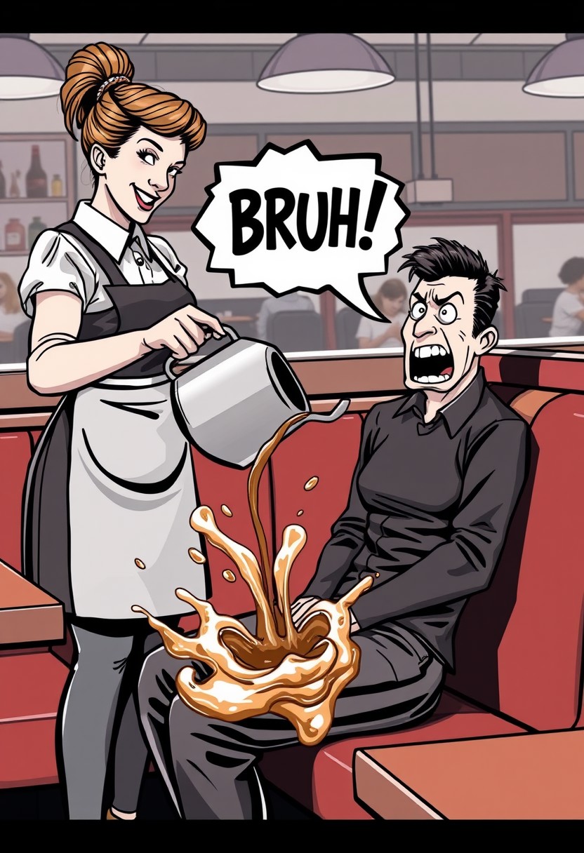 "Image of a waitress pouring a pot of coffee, but instead of aiming for the customer's cup, she's pouring it directly into their lap. The waitress is oblivious, looking the opposite direction with a cheerful expression, while the customer's face is contorted in shock and disgust. The customer is sitting at a booth. A speech bubble made of steam rising from the customer's lap reads 'Bruh!' in bold, comedic letters. The scene is chaotic and humorous, with coffee splashing everywhere and the customer's clothes getting stained. Style: comedic, exaggerated, and playful, with a focus on capturing the absurdity and surprise of the situation." Absurdres Highest-Quality, 4k