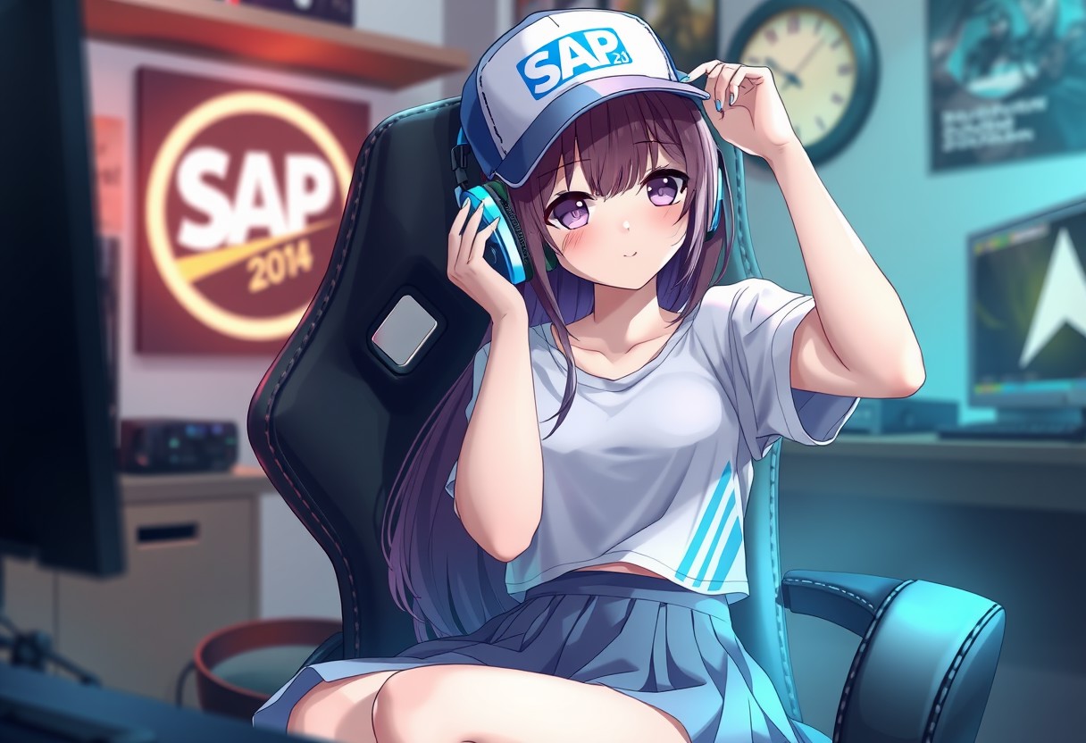 Beautifull yang 20 years old anime girl in her gaming room. The girl sitting on the chair in skirt and cap on her head with logo SAP text, puting one hand on her head and have headset in her other hand. High detail and an overall serene, masterpiece quality.