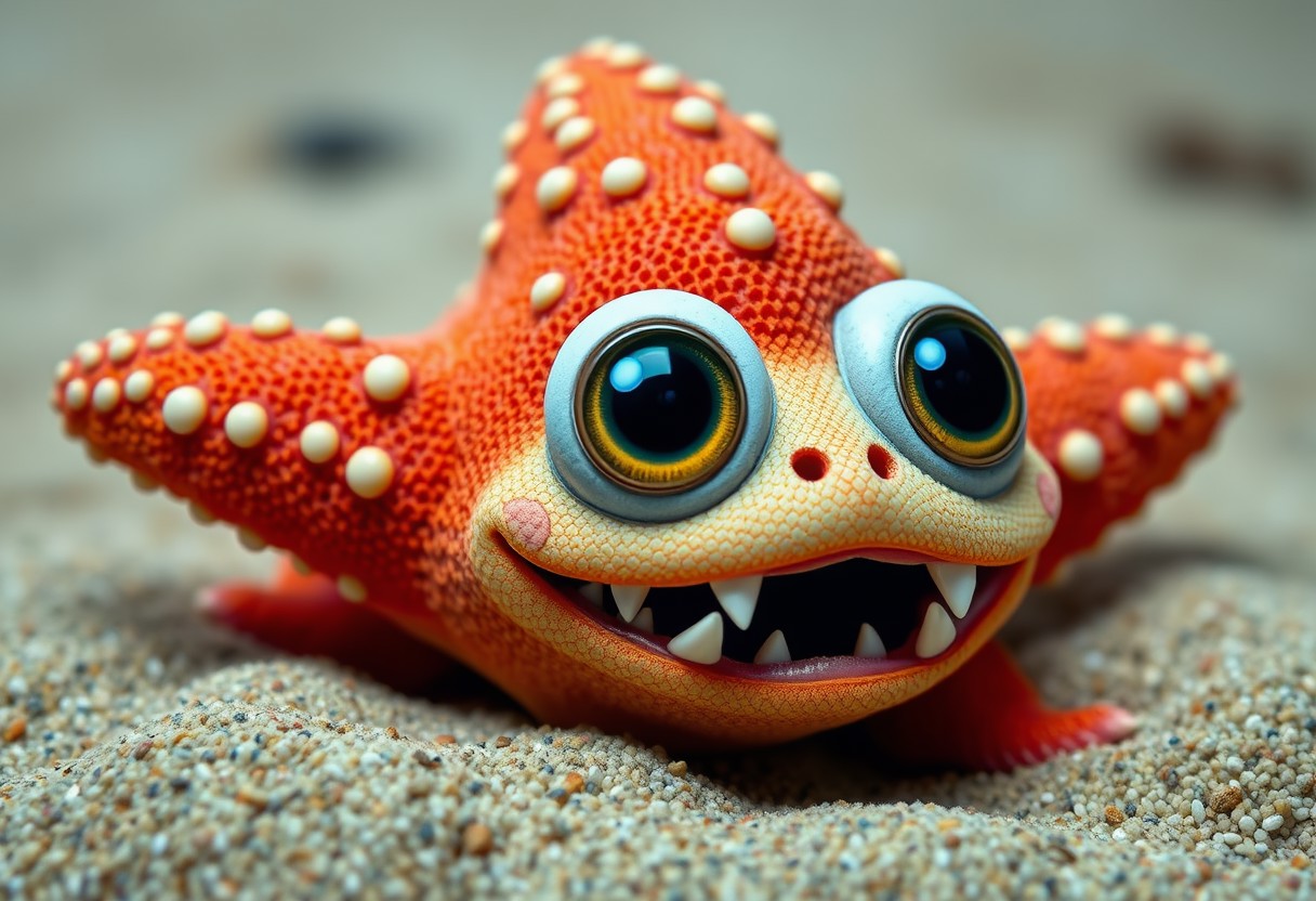 An adorable cuddly creature with huge eyes and pointy teeth, creepy cute. Starfish