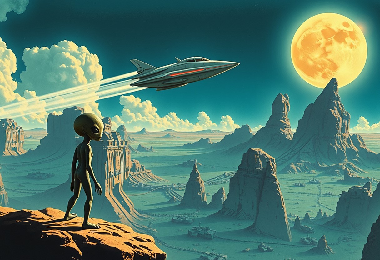 image in the style of soviet propaganda, a futuristic spaceship flying through the skies of an alien planet while a small alien looks on from a cliff in the foreground