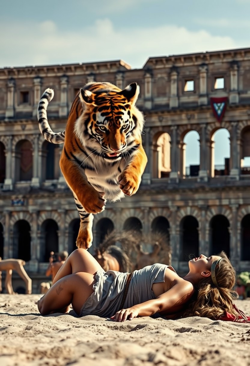 realistic photography of a majestic tiger jumping on a slave girl lying on the sand, ancient Rome Colosseum,