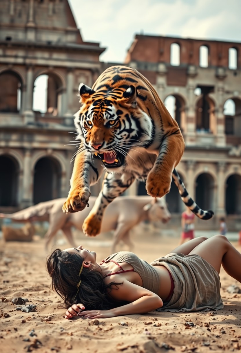 realistic photography of a majestic tiger jumping on a slave girl lying on the sand, ancient Rome Colosseum