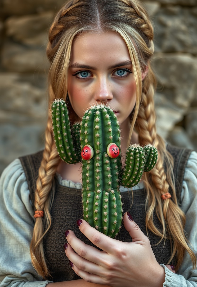 realistic photography of a cute cactus plant with face in the arms of a french women with blonde hair, freckles face, braids, medieval style