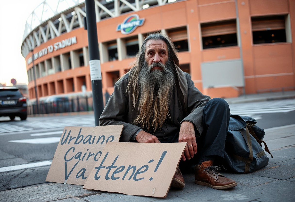 A homeless man with a long beard and long hair, sitting on the side of a street corner next to a city stadium, a cardboard sign is placed next to him that reads "Urbano Cairo - Vattene!"