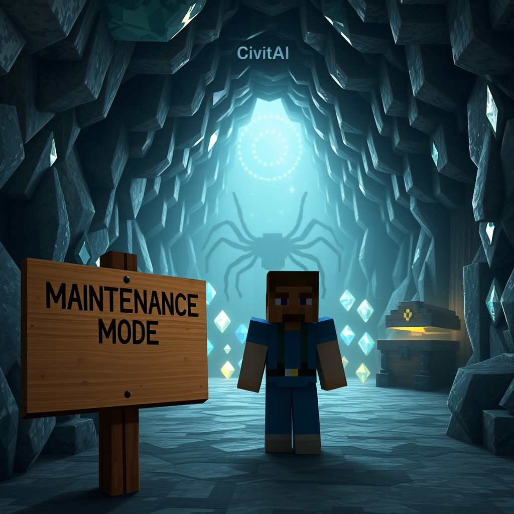 Deep inside a crystal cave in Minecraft. A wooden sign that reads "Maintenance Mode" on posted outside a dungeon with a Monster Spawner cage, inside a spider spins in liminal space, a Player resembling Steve from Minecraft with "CivitAI" Logo above, he stands before a chest in the distance surrounded by glowing diamonds.