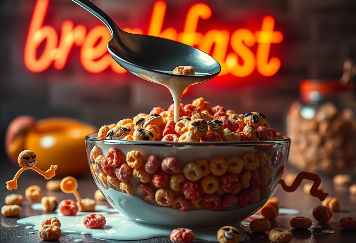 A photorealistic image of a bowl of happy lgbtq+ cereal with tiny, comically fierce faces on each piece, as a spoon looms over them like a horror movie villain. A big neon light sign in the background "breakfast" The cereal pieces are "running" away in panic, spilling milk everywhere. Photography, humorous, hyper-realistic, dramatic lighting, shallow depth of field.