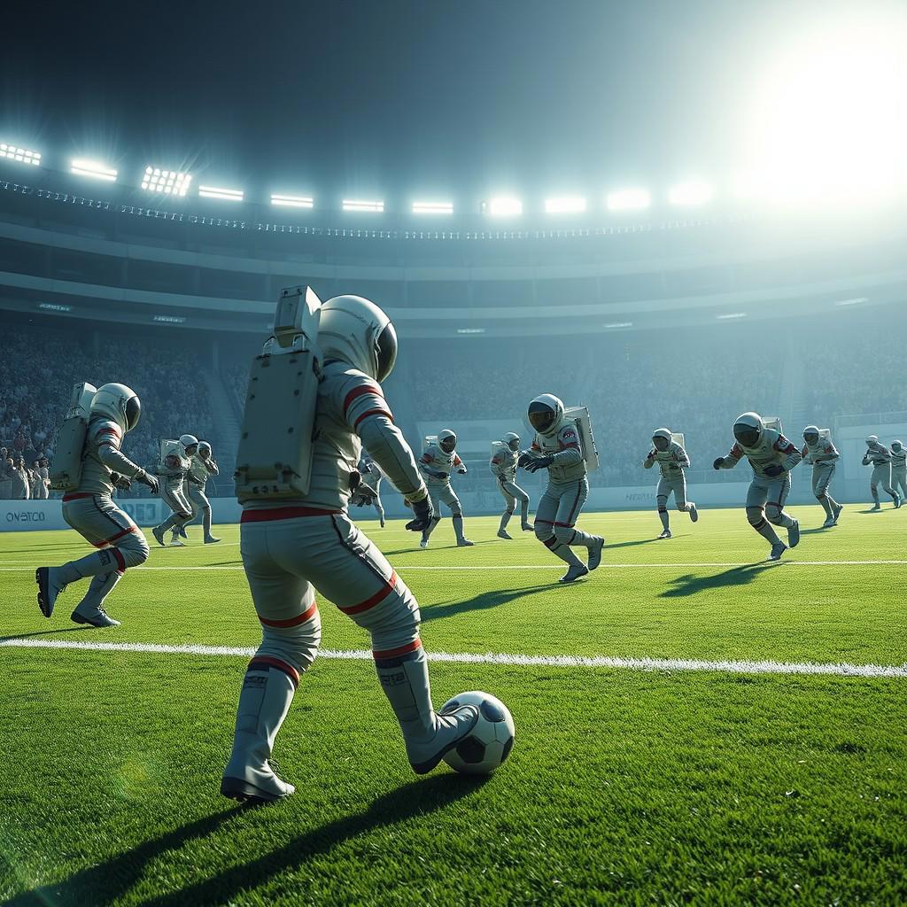 (22 NASA astronauts with full EVA suit from 2013:1.1) playing a soccer match in a soccer field on earth including the 2 goal keepers, wide view of the whole field, 8K HDR, Studio quality, Cinematic, intense, dramatic, epic