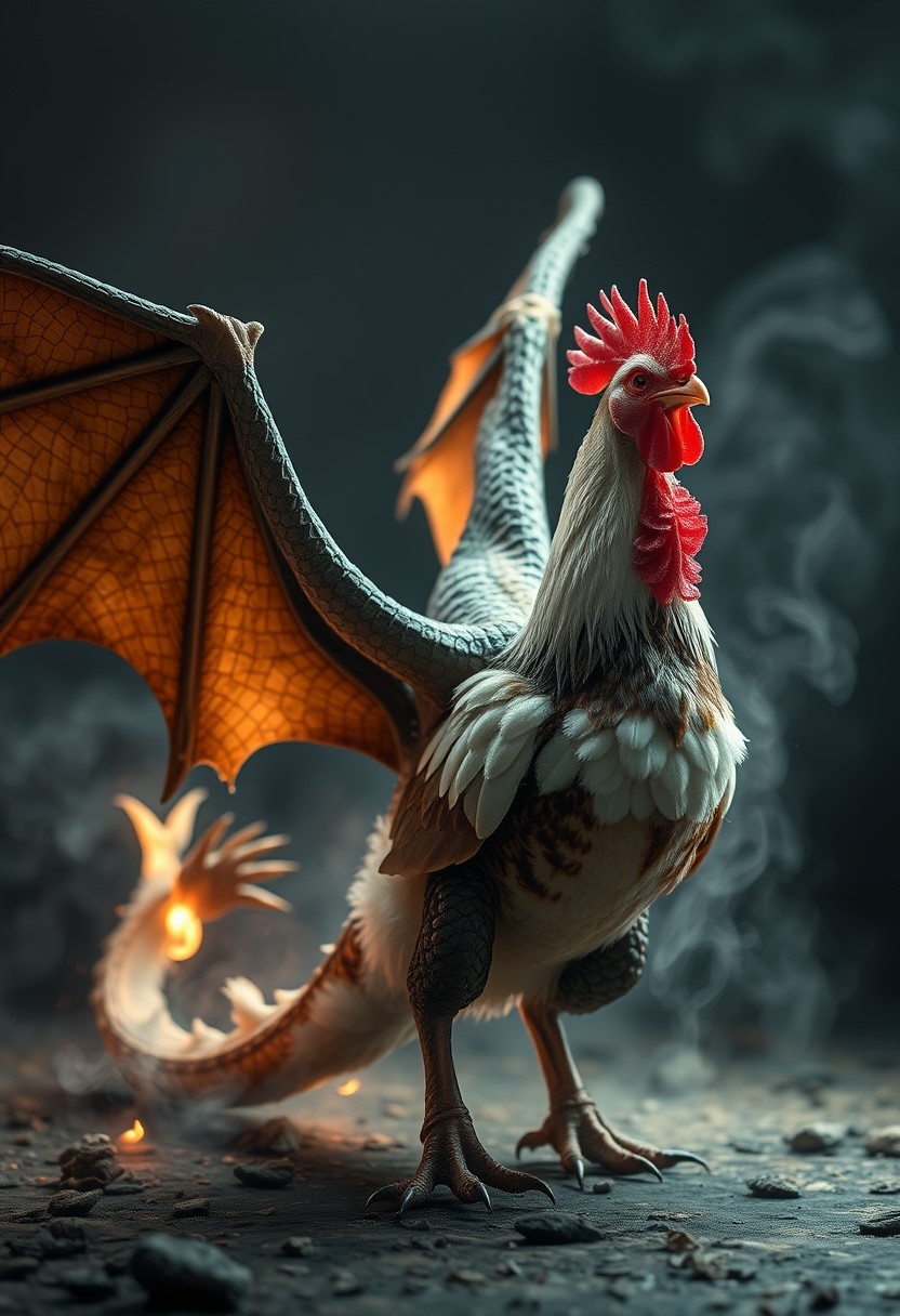 image showing a dragon mid-transformation into a chicken. The dragon's features, such as scales, wings, and claws, will partially blend with the emerging chicken form, like feathers and a beak. The scene will capture the mystical energy of the metamorphosis, with glowing light or magical aura surrounding the creature as the transformation takes place.