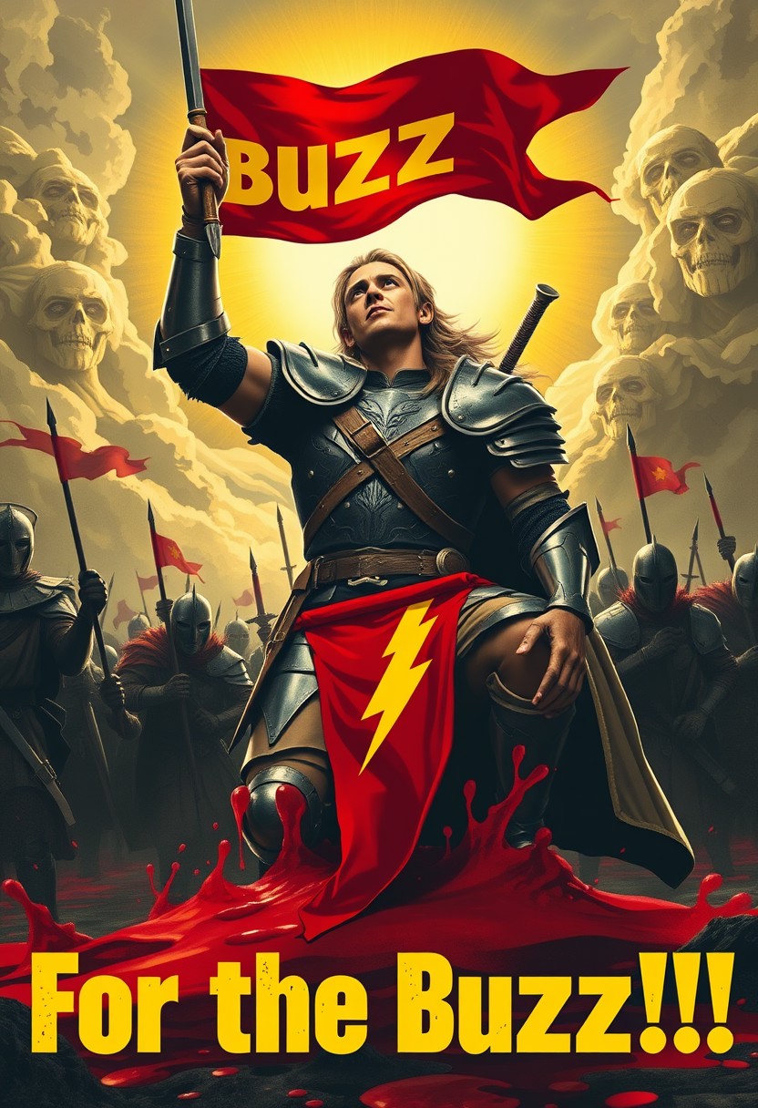 Propaganda Poster, text title stylized "For the Buzz!!!", a Lord of the Rings 3rd Age Legolas, worn armour, yellow lighting bolts logos on clothing. The enemies slain. The knee deep in the blood of enemies. Blood is bright yellow instead of red. Banner planted in the heart a slain enemy. the Day is won, the sun gloriously shines a new day, Hero looks glorious, head raised towards the sky above Heroic,
