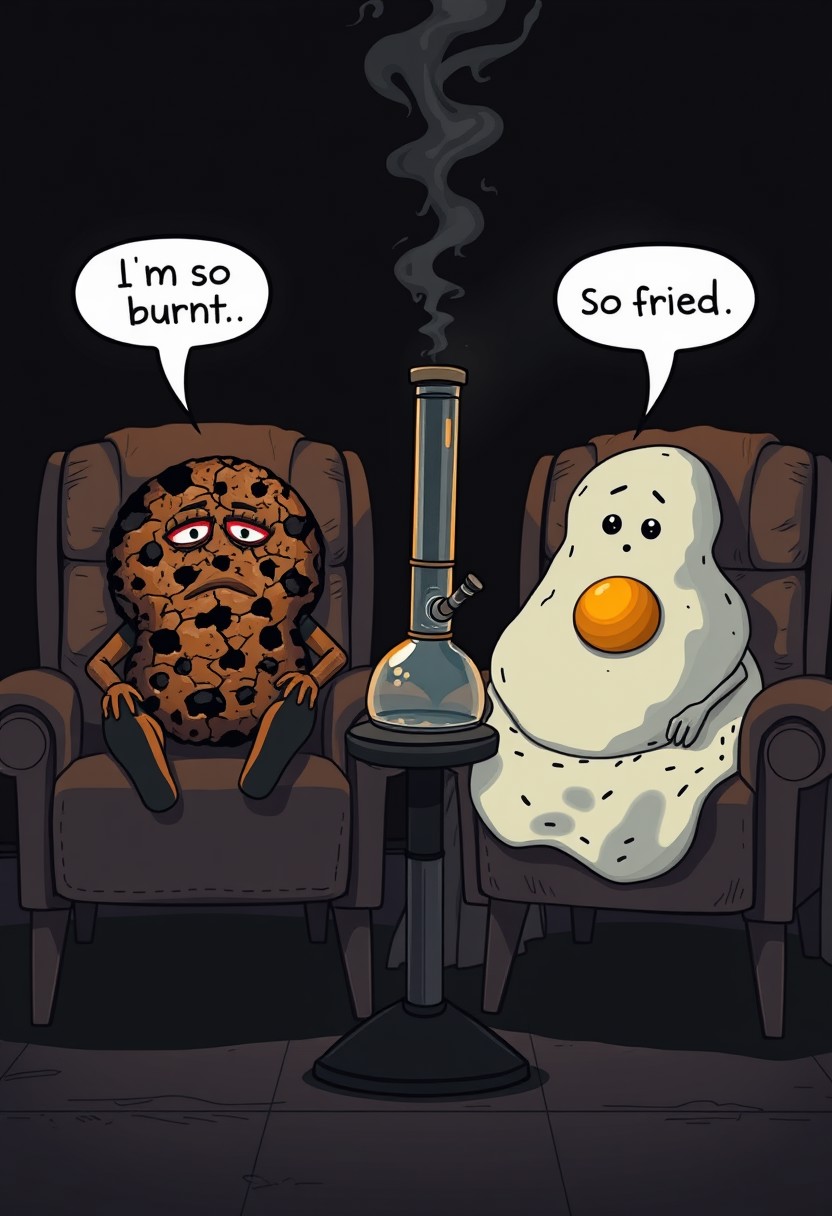 "Image of two recliners side by side, each occupied by a snack food with a rough night. In one recliner, a burnt cookie sits slouched back, its eyes bloodshot and its surface cracked and charred. Next to it, a fried egg sits in a similar state, its eyes also bloodshot and its whites congealed. Between the two recliners, a stand holds a bong, with smoke still rolling out of it, suggesting a long night of indulgence. The cookie's speech bubble reads 'I'm so burnt', while the egg's speech bubble reads 'I'm so fried'. The scene is dimly lit, with a haze of smoke hanging in the air, and the overall atmosphere is one of exhaustion and regret. Style: humorous, relatable, and slightly disturbing, with a focus on capturing the aftermath of a wild night." Hyper realistic Absurdres Highest-Quality, 4k