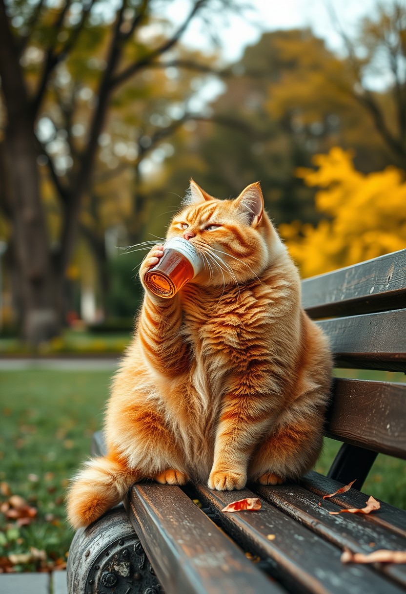 Fat chubby ginger cat sitting on park benxh and drinking beer in park, dynamic angle, warm hues, realistic, photorealism, hd, 8k, high definition, BREAK, score_9, score_8_up, score_7_up, score_6_up