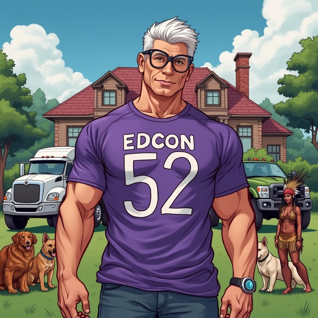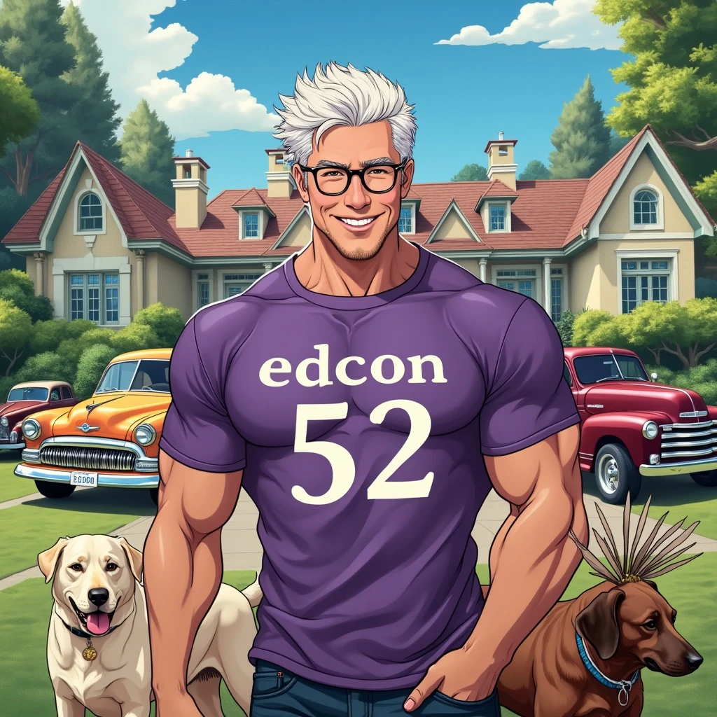 Young white hair muscular man with glasses wearing purple shirt saying EDCON celebrating 52 birthday with lots of expensive cars and trucks in front of mansion with three dogs and young beautiful native girl wearing head dress