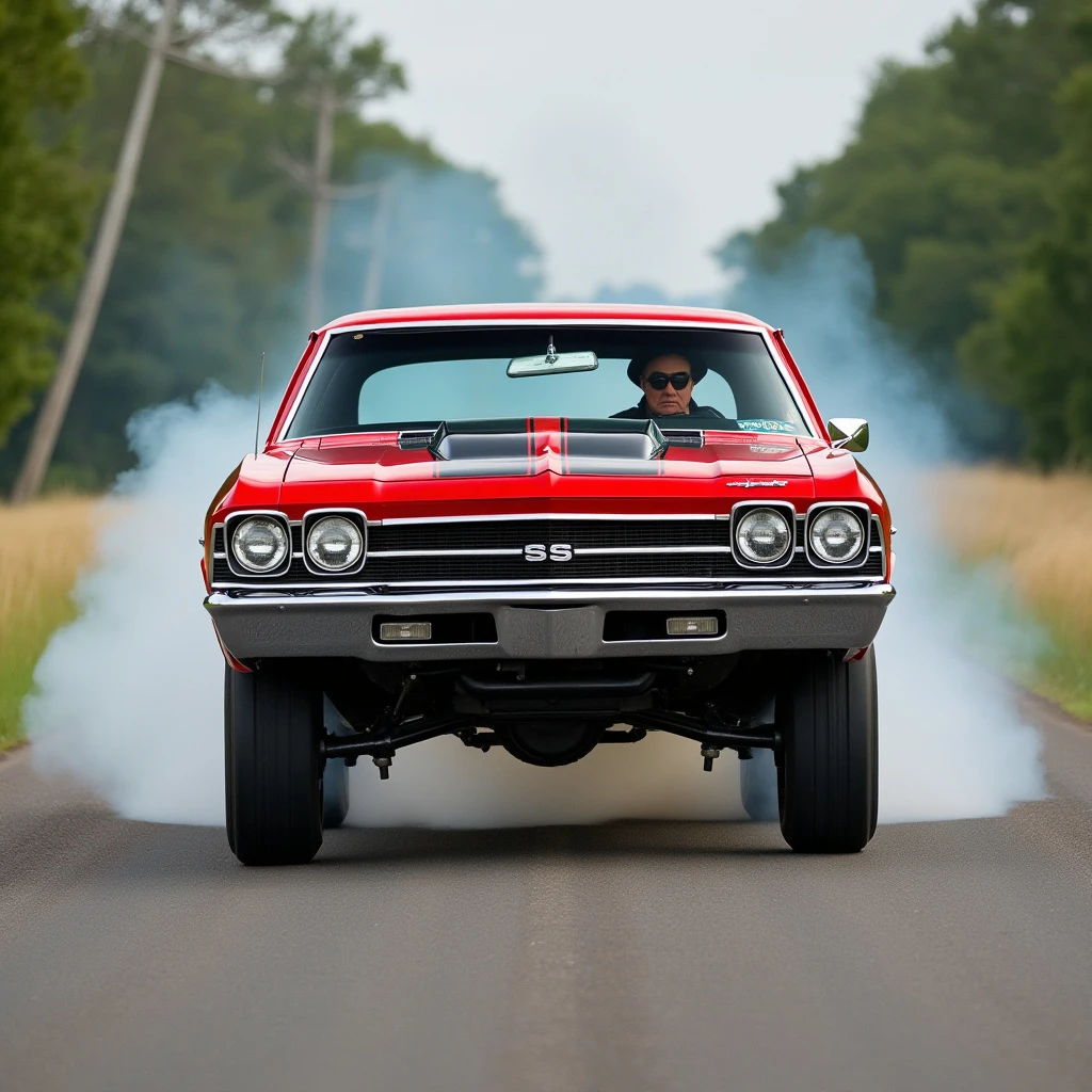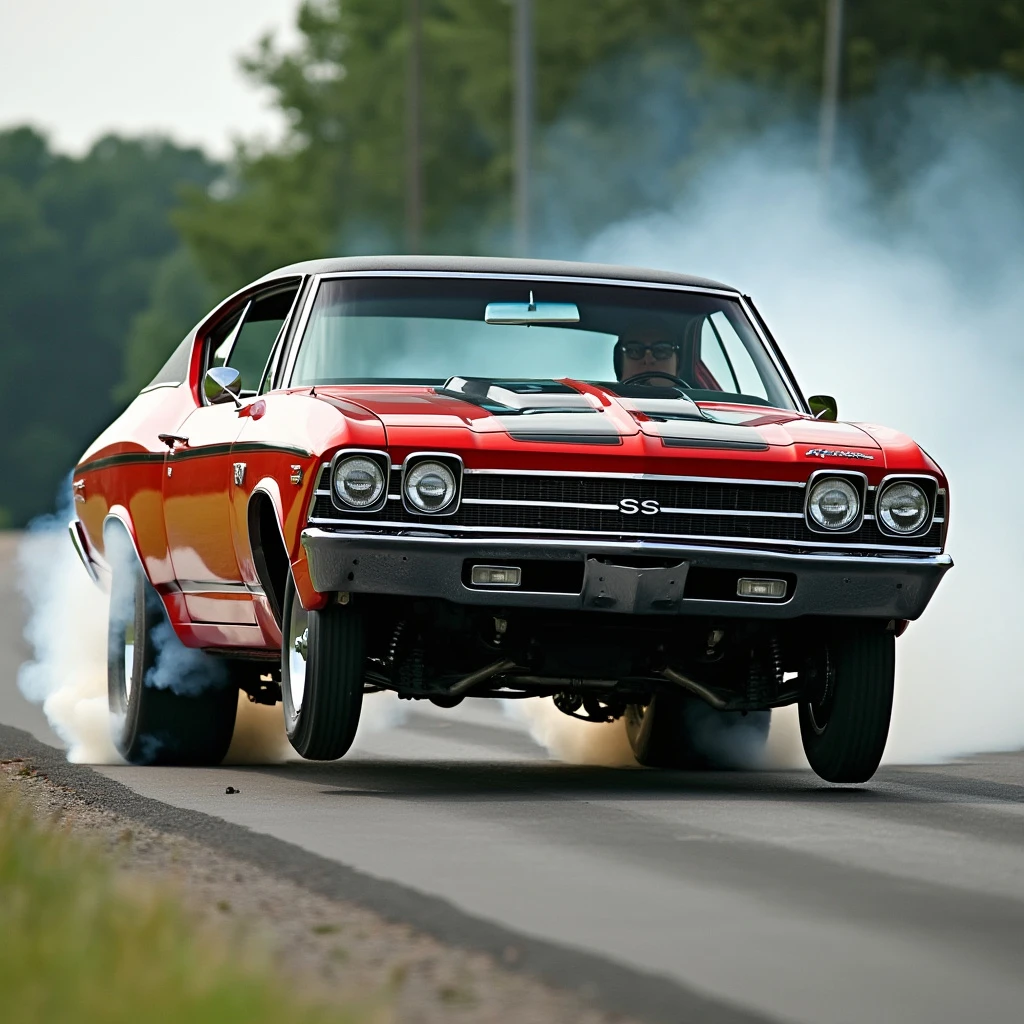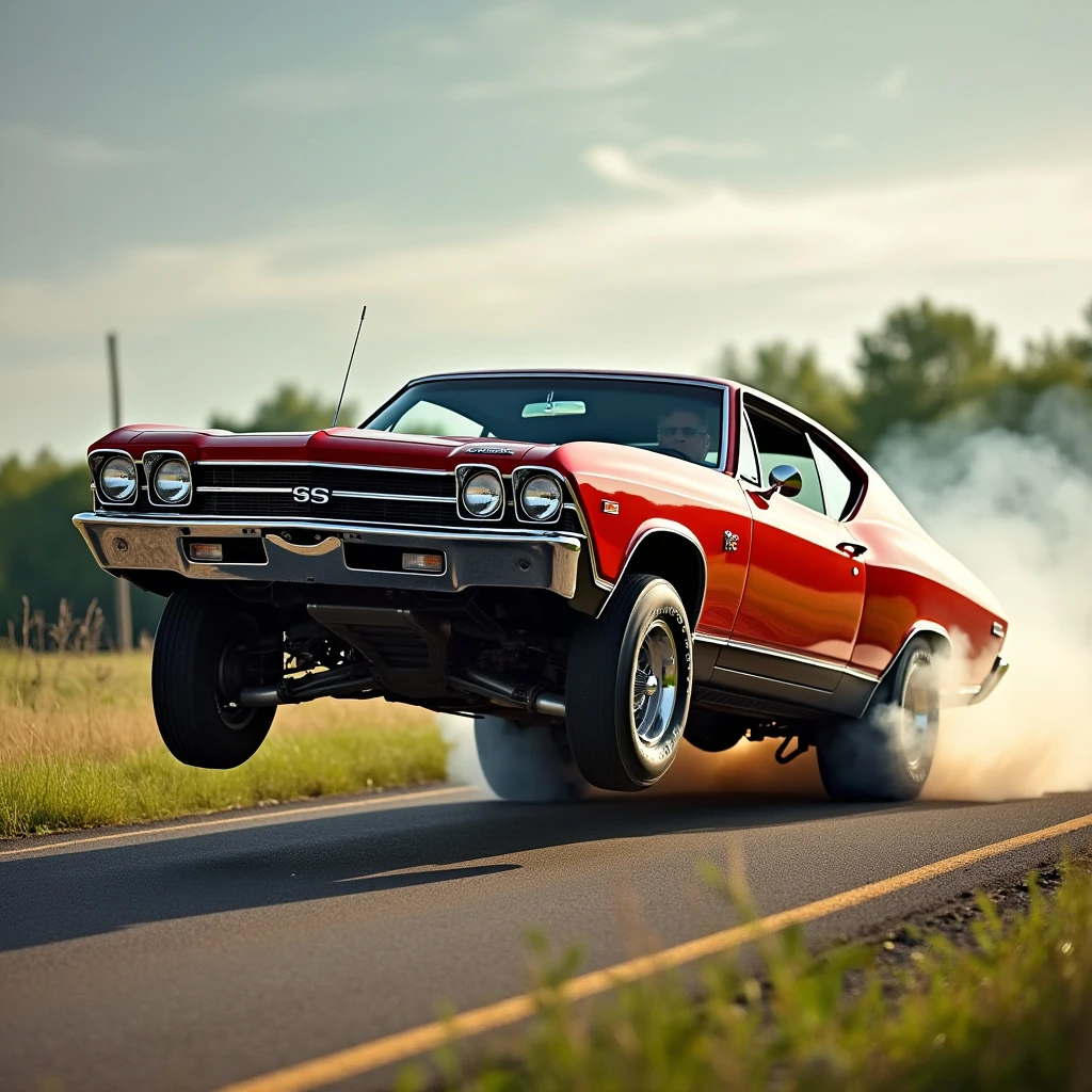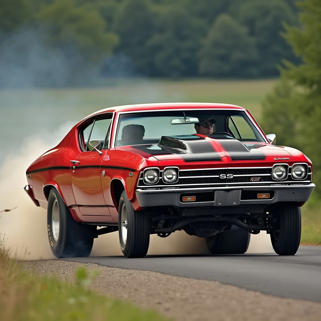 1968 chevelle ss 454 in red with black stripes with a driver. It's pulling a wheelie with lots of tyre smoke. down a country road.