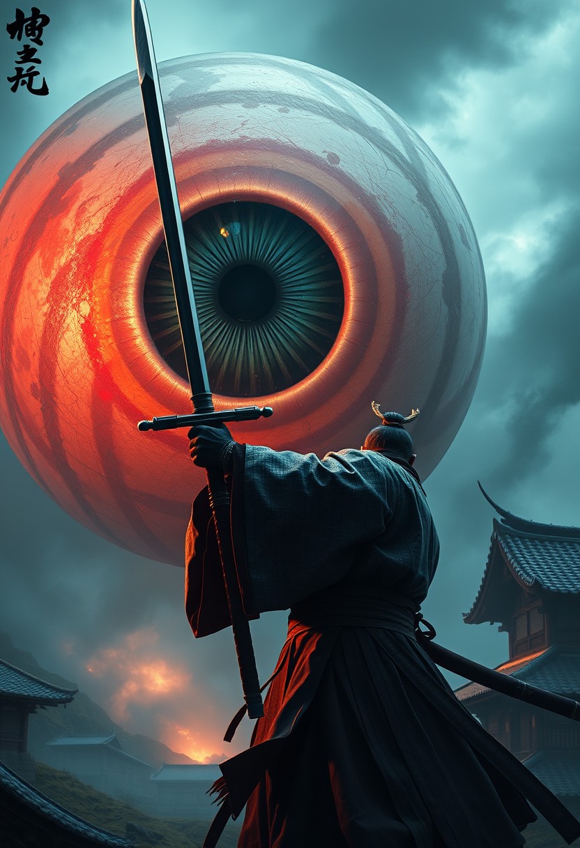 cinematic, 32k, hyper detailed, a korean warrior holding a sword against a giant eyeball, long sword, korean costume, korean village