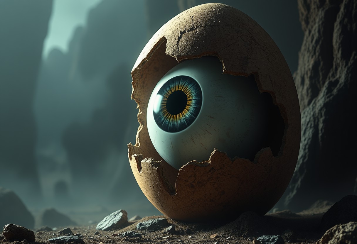 cinematic, 32k, hyper detailed, a giant eyeball hatching out of a giant egg