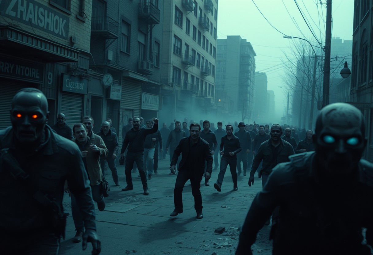 photo , Film Still, Cinematic ,Blanco Brown - 7 days to die, Zombies hoard attack suriviors, urban decay, glowing eyes, in every shadow death does embark