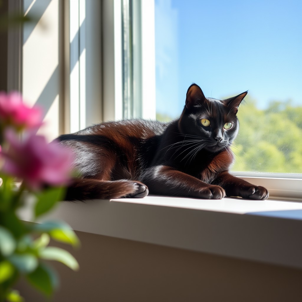 solid black american shorthair cat laying on a window shelf on a sunny day