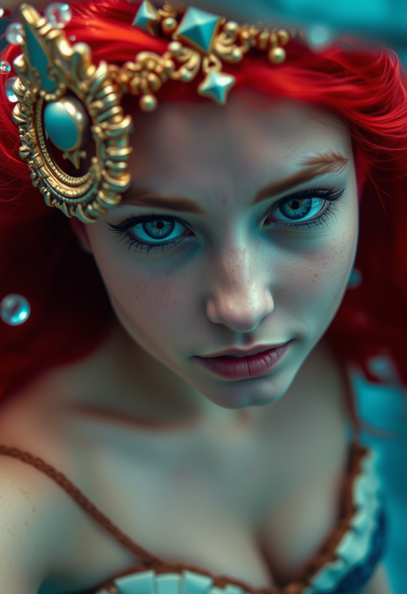 Close Up shot of Ariel as a warrior princess at the ocean, underwater, Low saturation color photography, vintage, grunge, top hard light
