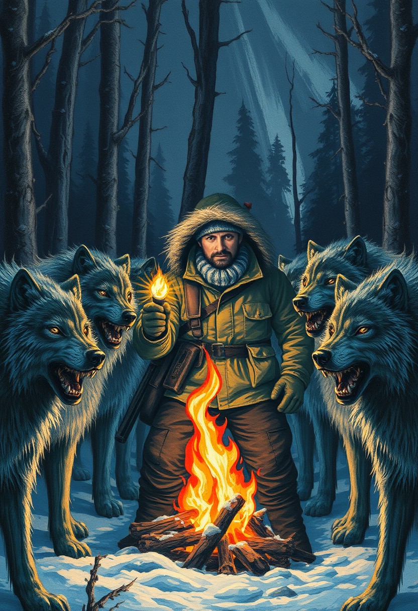 "Image of a tense and dramatic scene, where a man dressed in winter survival gear is surrounded by a pack of hostile wolves. The wolves' eyes glow with an eerie light in the darkness, their fur standing on end as they prepare to attack. The man holds a lit torch, trying to keep the wolves at bay, but they seem undeterred by the flames. The campfire in the background is still burning, casting flickering shadows on the trees, but it's clear that the man's attention is focused on the snarling pack. The image is created with colored pencils, with bold lines and dark shadings that emphasize the danger and tension of the scene. The overall atmosphere is one of fear and survival, with a focus on capturing the intense confrontation between the man and the wolves. Style: dramatic, intense, and suspenseful, with a focus on capturing the primal fear of being surrounded by predators." Highest-Quality, 4k