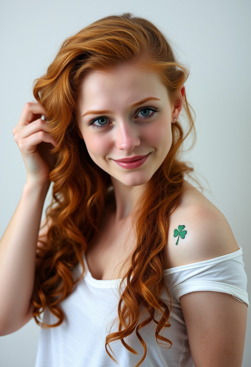a portrait of a redhead with very pale skin, freckles , irish woman with long curly hair and no makeup.she has a coy smile and is cross-eyed, there is a sparkle in her green eyes. she is wearing a see-through off one shoulder white t-shirt which shows a tattoo of a small four leaf clover on her shoulder she is running one hand through her hair, her head is tilted to the side in a coy fashion