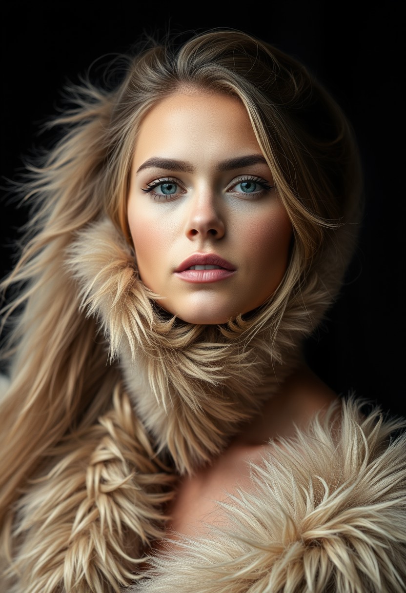 full-length view of a beautiful Scandinavian woman sprouting thick furry fuzzy fluffy fur all over her body and face