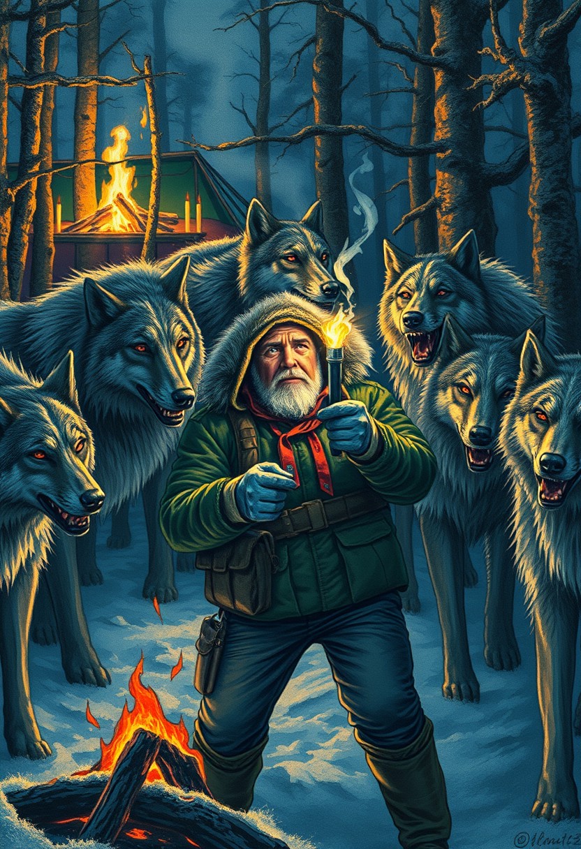 "Image of a tense and dramatic scene, where a man dressed in winter survival gear is surrounded by a pack of hostile wolves. The wolves' eyes glow with an eerie light in the darkness, their fur standing on end as they prepare to attack. The man holds a lit torch, trying to keep the wolves at bay, but they seem undeterred by the flames. The campfire in the background is still burning, casting flickering shadows on the trees, but it's clear that the man's attention is focused on the snarling pack. The image is created with colored pencils, with bold lines and dark shadings that emphasize the danger and tension of the scene. The overall atmosphere is one of fear and survival, with a focus on capturing the intense confrontation between the man and the wolves. Style: dramatic, intense, and suspenseful, with a focus on capturing the primal fear of being surrounded by predators." Highest-Quality, 4k