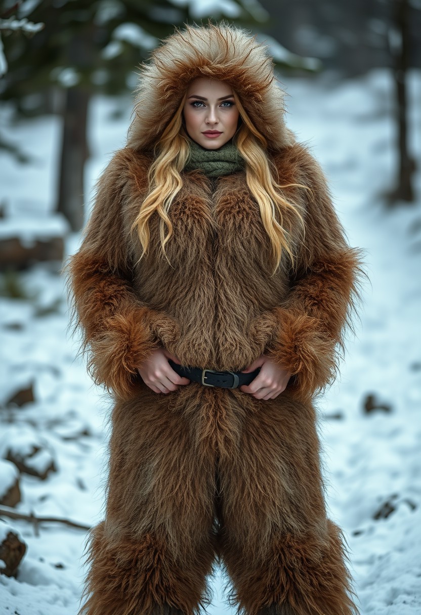 full-length view of a beautiful Scandinavian woman with thick furry fuzzy fluffy fur growing all over her body and face