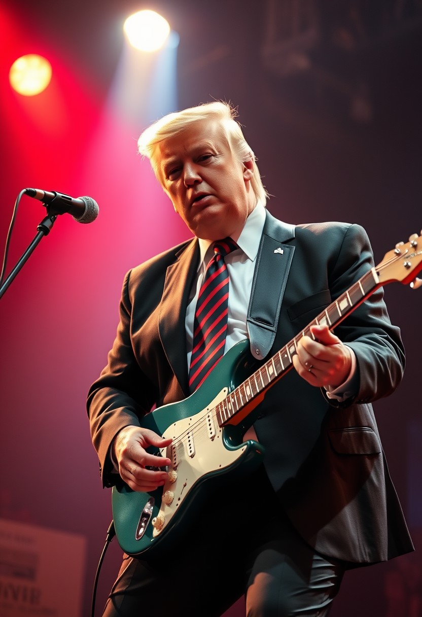 extremely photorealistic ultra-detailed, An intense, photorealistic photography the president Trump while play an electric guitar on the stage, he is a very special performer.