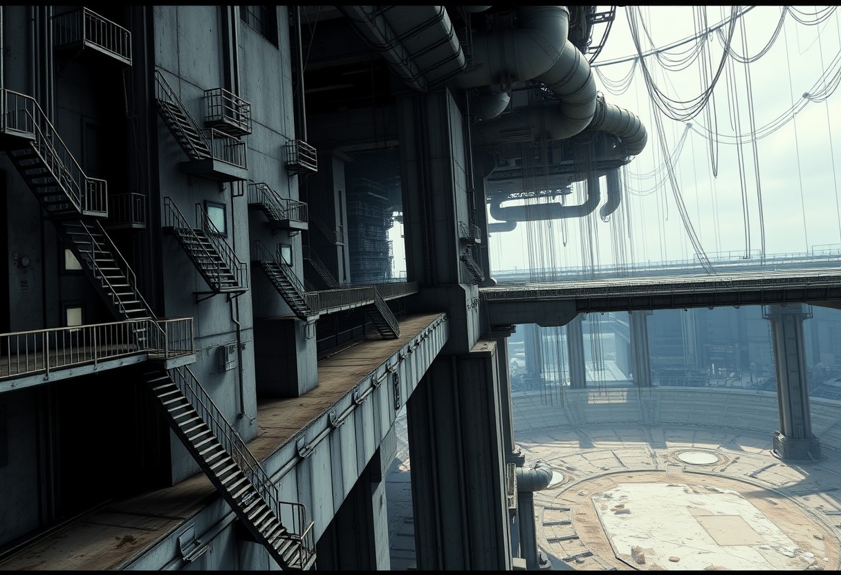 A colored CGI movie still of a megastructure in the style of blame!, with manga lineart, lots of black filling spaces, a dark horizon, and a spiritual lonely journey. The scene shows a huge open plane, a megacity, a huge open space, a brutalist architecture, stairways on towers and pillars, long slim connecting bridges, and a far away arena ceiling with cables hanging down, large pipes. The materials are dull metal and concrete. The mood is lonely, dark and gloomy. The perspective is from the side, wide lens. The scene also suggests that the megastructure is inside a giant artificial habitat, and has cables, wires, cracks and dirt. . A colored CGI movie still of a megastructure in the style of blame!, with manga lineart, lots of black filling spaces, a dark horizon, and a spiritual lonely journey. The scene shows a reactor, a reactorcore, windows, entrances, archways, an american mountainsummit, mountainrides, a megacity, a huge open space, a brutalist architecture, stairways on towers and pillars, long slim connecting bridges, and a far away arena ceiling with cables hanging down, large pipes. The materials are dull metal and concrete. The mood is lonely, dark and gloomy. The perspective is from the side, wide lens. The scene also suggests that the megastructure is inside a giant artificial habitat, and has cables, wires, cracks and dirt.