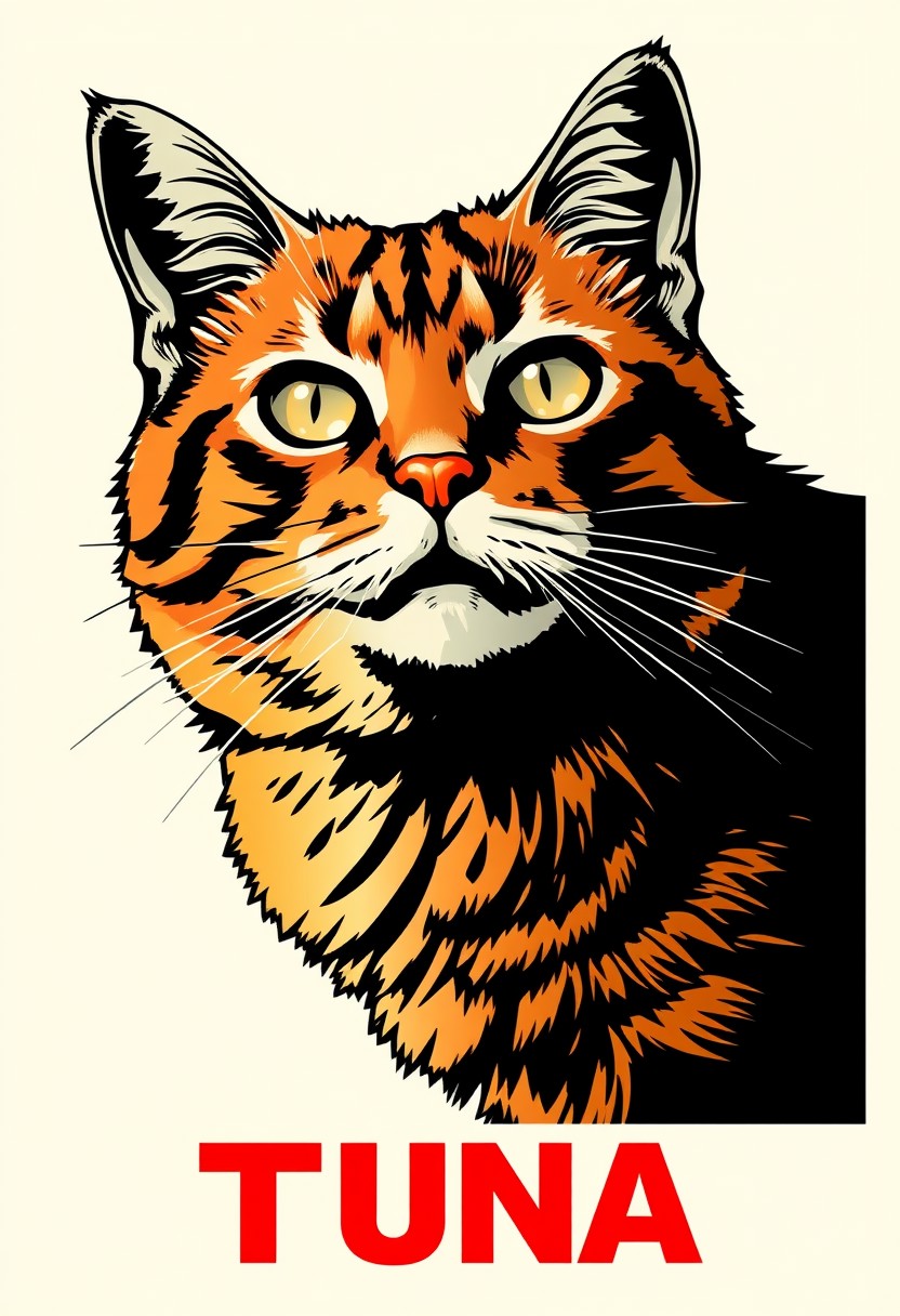 Comic-style Ginger Cat in the Shepard Fairey "HOPE" aesthetic, focusing on the cat's face. The design uses a bold black and white contrast with minimalistic detailing. "TUNA" is prominently displayed at the bottom in large, red bold letters.