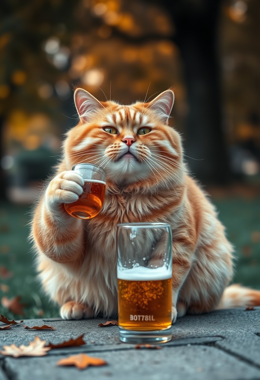 Fat chubby ginger cat drinking beer in park, dynamic angle, warm hues, realistic, photorealism, hd, 8k, high definition, BREAK, score_9, score_8_up, score_7_up, score_6_up