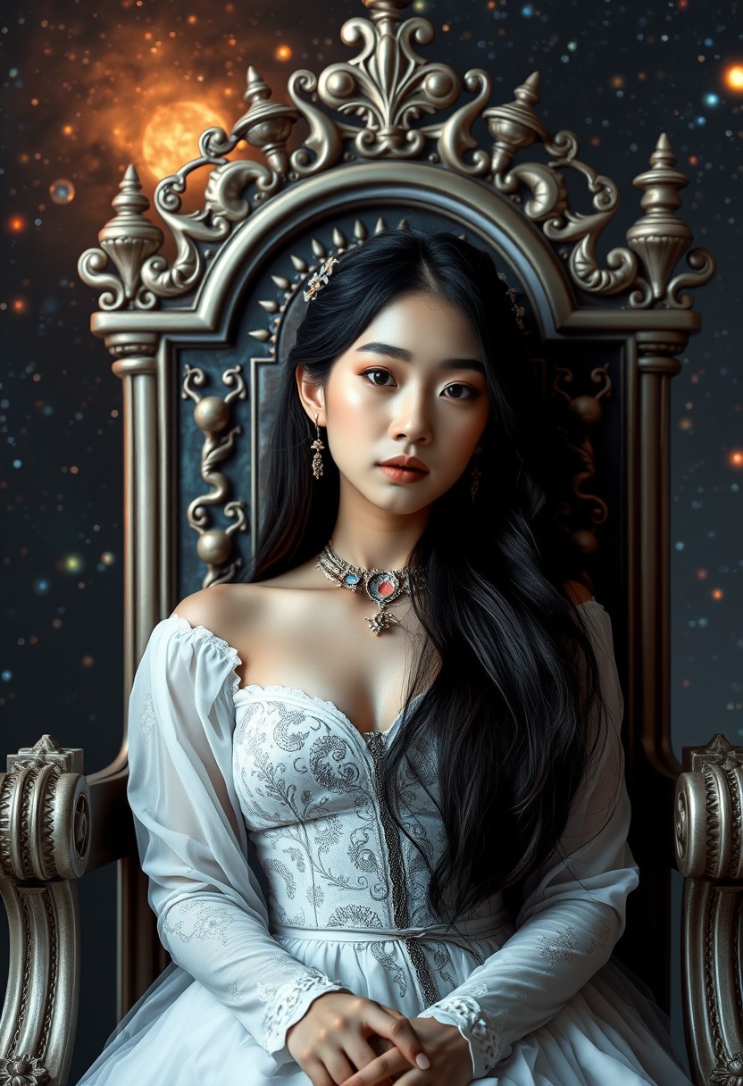 Stunning portrait of the beautiful Queen of the Cosmos, with Asian skin, sitting on an Ethereal Throne, ((Gorgeous albino girl) ), Use warm tones and soft lighting, galaxy background
