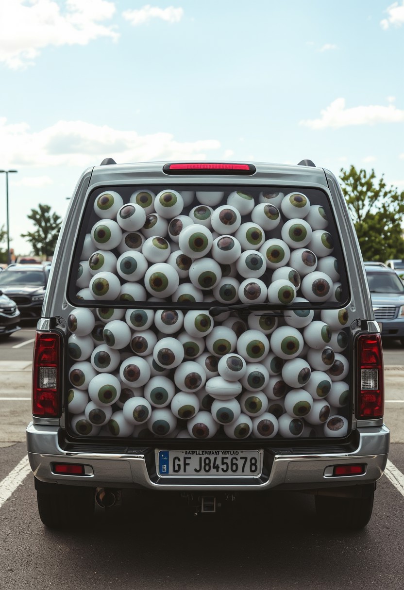 photo of a endless number of eyeballs filled a completely transparent SUV in the parking lot