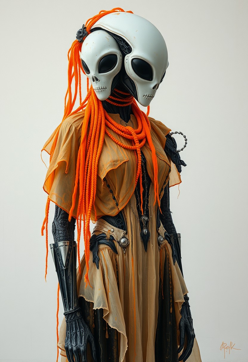 Ethereal minimalist Alien race cybergoth fashion photography painting, in the style of fluorecent orange, pearl_white black and silver, heavy use of palette knives, full body wide shot painting of teachment, intricate, sharp_focus, concept_art