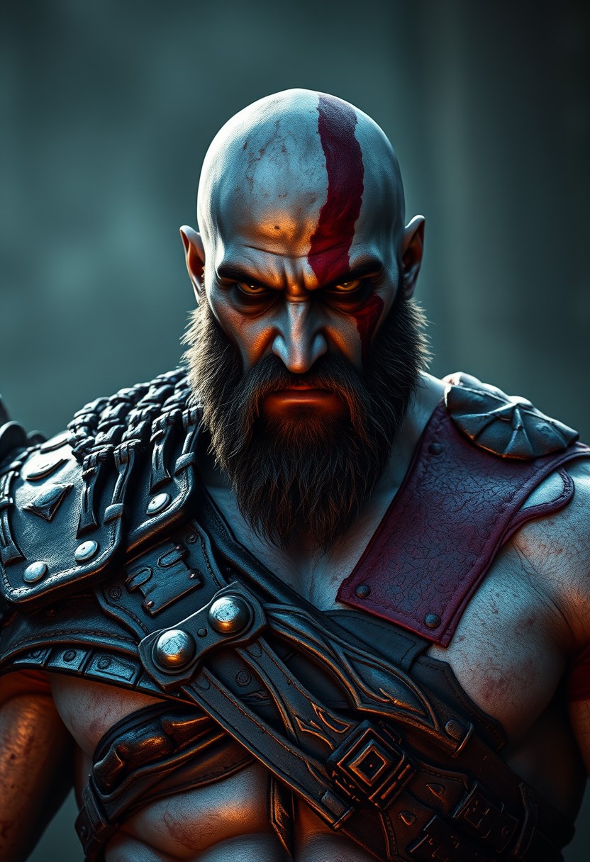 A hyper-realistic cinematic photograph of Kratos from God of War. He is dressed in armor and depicted in all his battle-worn glory. photography, shadows, raw photo, detailed, realistic, photograph, cinema quality