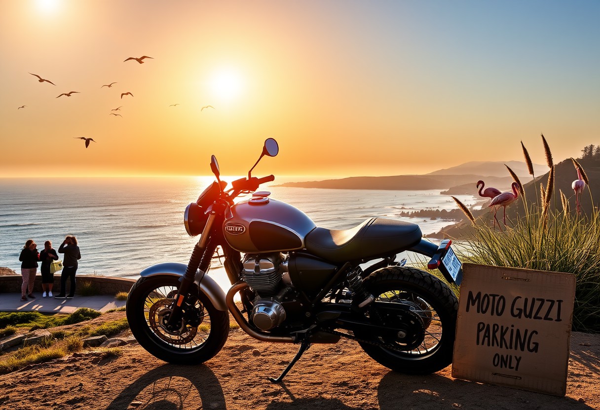 “A twin-cylinder Custom Cruiser Moto Guzzi motorcycle is parked along the scenic coast of Santa Barbara at sunset. The bike sits proudly on a cliffside overlooking the ocean, with a golden sunburst casting a warm glow across the sky. Seabirds glide above the serene blue waters, and a small group of people stands nearby, their silhouettes softly illuminated by the setting sun. Off to the side, a couple of flamingos stand near tall grasses swaying in the breeze. A weathered cardboard sign is propped up next to the bike, with the words ‘MOTO GUZZI PARKING ONLY’ handwritten on it, adding a touch of personality to the scene.”
