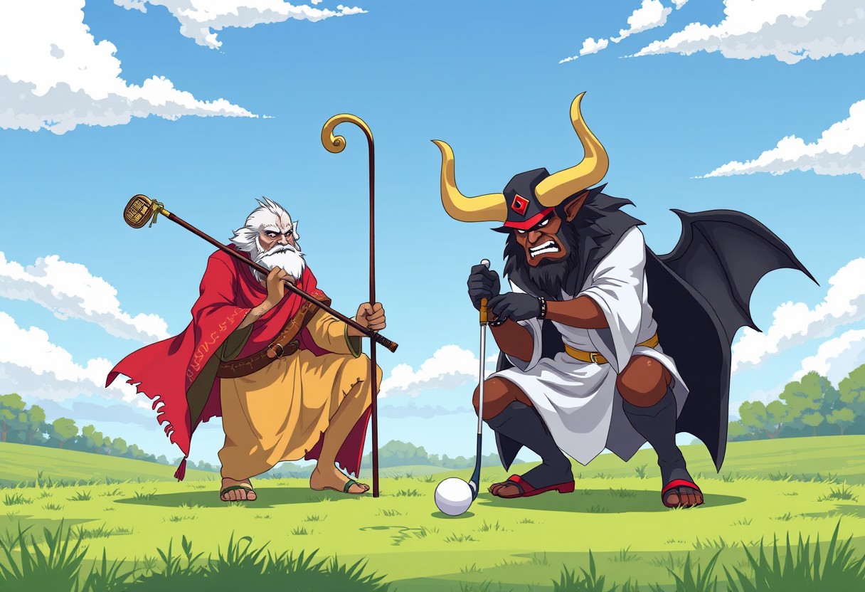 God and satan playing golf Anime style