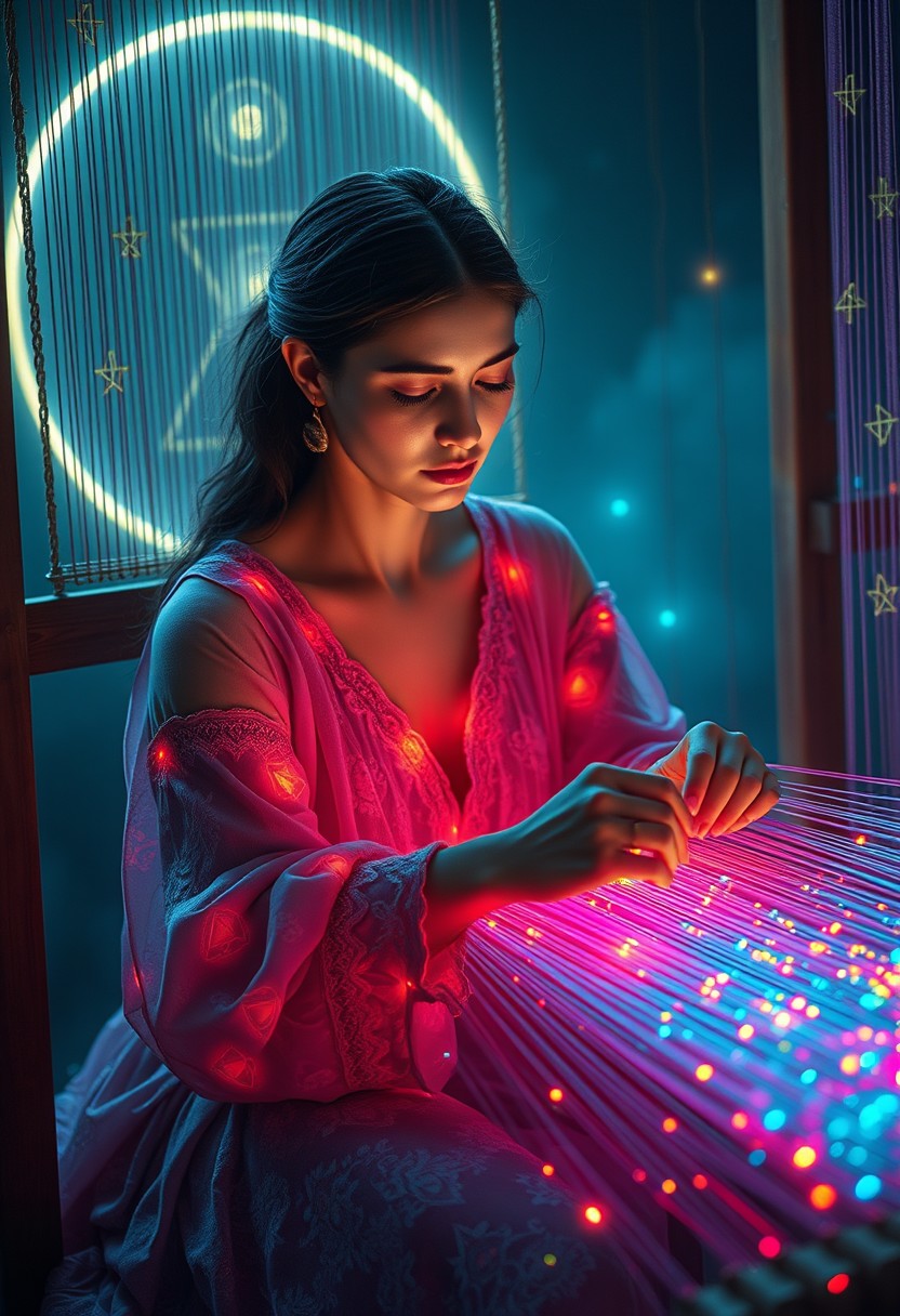 Create a surreal, dreamlike scene of a woman sitting at a loom, weaving a tapestry of memories. The loom is surrounded by a halo of soft, pulsing light, and the threads of the tapestry are made up of glowing, iridescent fibers that seem to shift and change color as they are woven. The woman's face is serene and intent, her eyes closed as she focuses on the weaving. Her hands are manipulating the threads, which are connected to distant events and people, shaping the course of history. Incorporate subtle, glowing symbols or patterns to the threads or the loom to enhance the sense of mysticism and wonder. Use vibrant, glowing colors and subtle, pulsing effects to bring the threads to life. The atmosphere should be dreamy and ethereal, with a sense of depth and mystery. Style: surreal, dreamlike, mystical. Colors: vibrant, glowing, iridescent. Highest-Quality, 4k