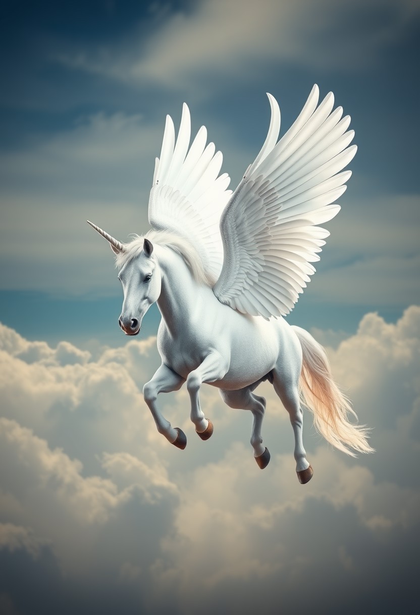 Photographically detailed ultra-realistic flying white unicorn with big white feather wings, background with clouds, dramatic light, 8k, HD