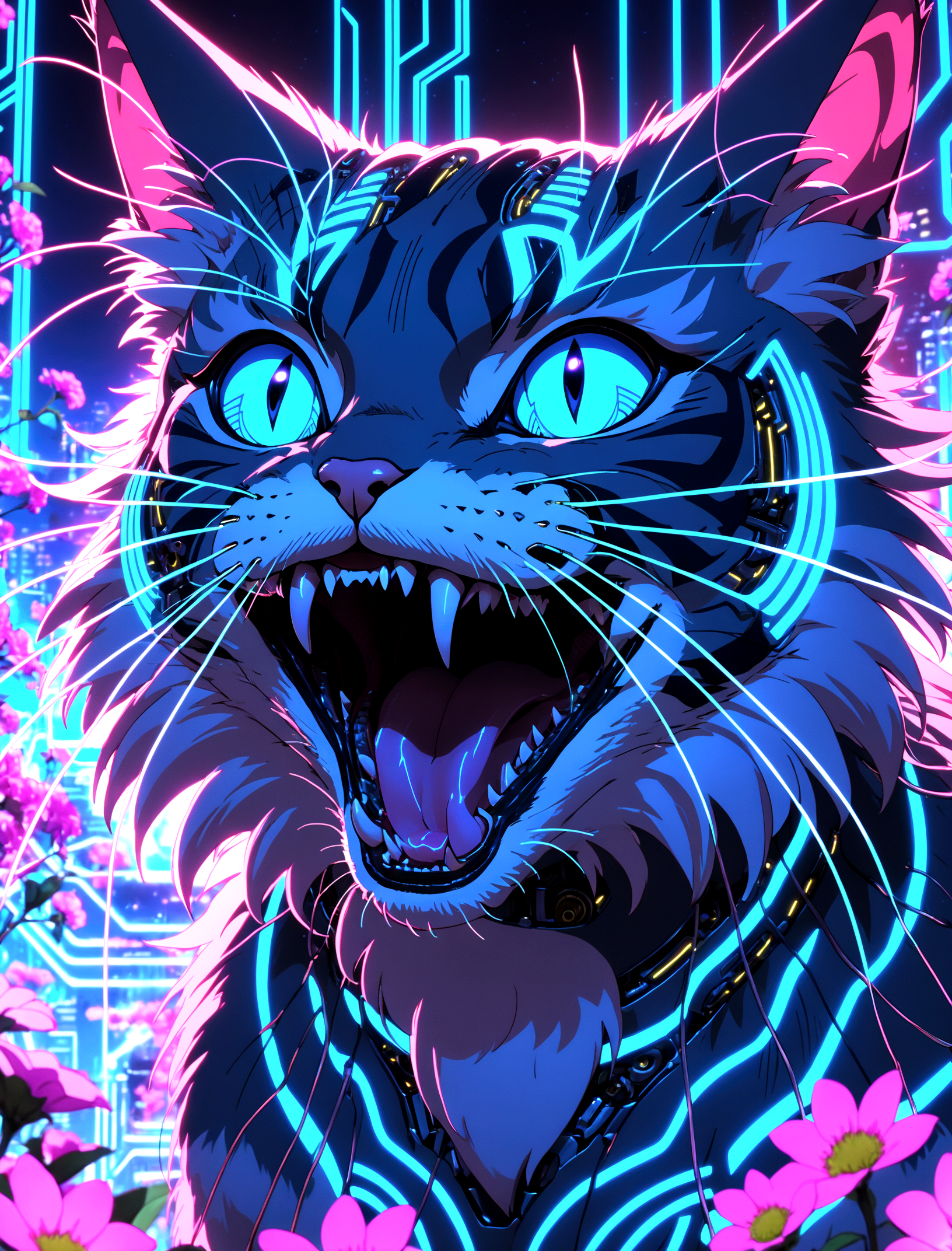 (anime screencap:1.3) of a Ethereal cat wide open its mouth revealing sharp fangs in a colorful floral field, with cybernetic patterns faintly overlaying the background. extremely intricate soft glows on the intricate circuit lines, creating a sense of energy. intricate neon light reflections subtly integrated on the cat's fur. Close-up of the digital elements, showing detail.