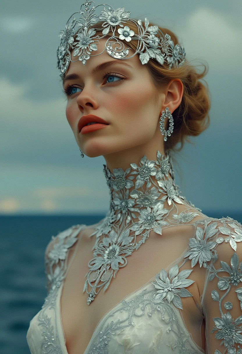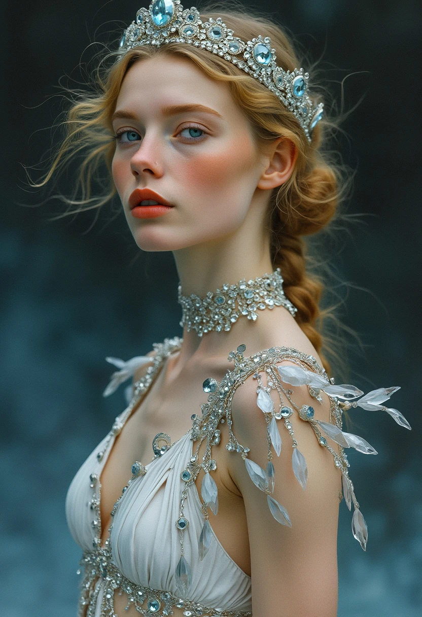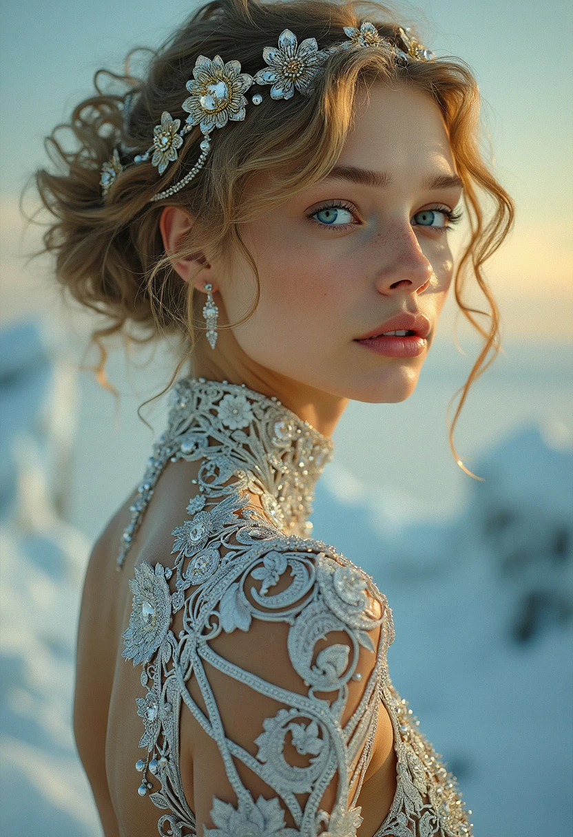 art nouveau art by Gerhard Munthe and Abram Efimovich Arkhipov, erotisch, lasziv, Slim Icelandic maiden with piercing blue eyes reflecting glacial purity and platinum waves, As the sun slowly dips below our horizon for some to call out as a middle aged and futuristic gymnastics competition takes hold. But this time, no matter the intensity of their creation, tiara adorns its head, displaying a unique ensemble. Clad entirely in sleek, silver designs from the same fabric â it is adorned with delicate geometric shapes depictoring an eclectic mix of colors and forms, , Norwegian National Romanticism, decorative arts, folk motifs, critical realism, rural landscapes, genre scenes, capturing the everyday life of Russian peasants, empathetic portrayals, social commentary