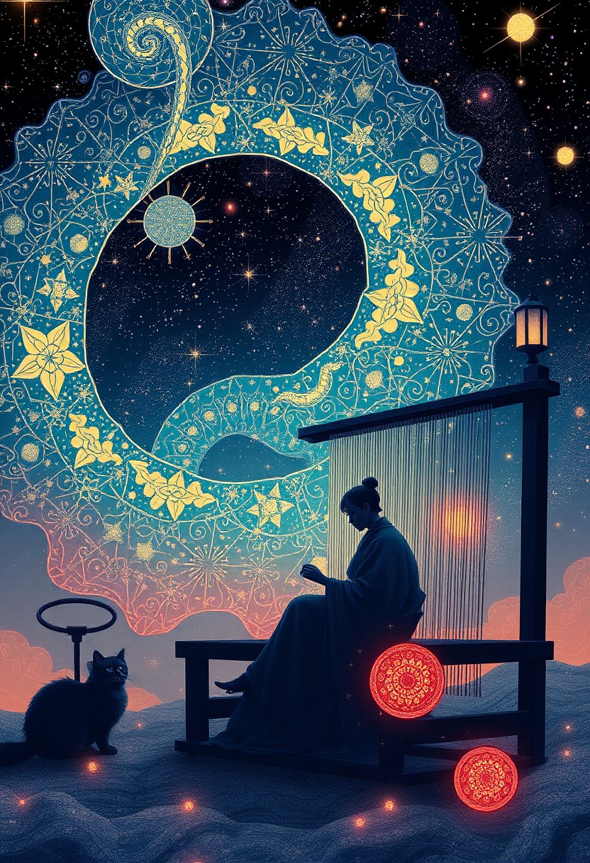 Create a surreal, dreamlike scene of a figure sitting at a loom, weaving a tapestry of stars and galaxies. The figure is surrounded by a halo of soft, pulsing light, and the loom is adorned with intricate, glowing patterns that seem to shift and change as the figure weaves. The art style is a fusion of traditional Japanese ukiyo-e woodblock prints and modern digital art, with bold, flat colors and intricate, detailed patterns. Style: ukiyo-e, digital, surreal. Colors: bold, flat, glowing. Highest-Quality, 4k, Masterpiece