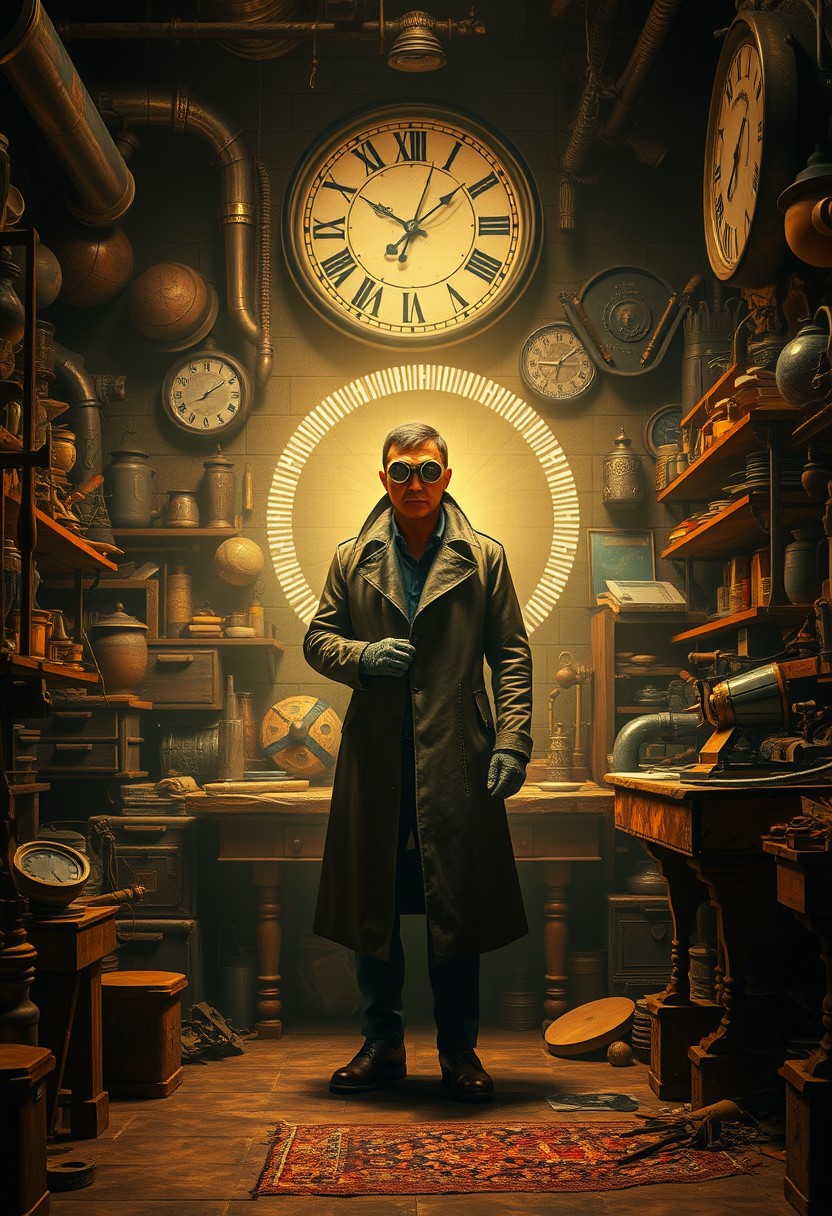 Create a cluttered, dimly lit workshop filled with strange and exotic artifacts from different eras and cultures. There's a workbench in the center of the room, covered in tools and half-finished projects, and a large, ornate clock on the wall that seems to be ticking away with an otherworldly rhythm. In the center of the image, a lone figure stands, surrounded by a halo of soft, pulsing light. The figure is dressed in a long, worn leather coat and a pair of goggles perched on their forehead, and is holding a strange, glowing device in one hand. Style: cluttered, dimly lit, mystical. Colors: warm, golden, glowing. Highest-Quality, 4k, Masterpiece