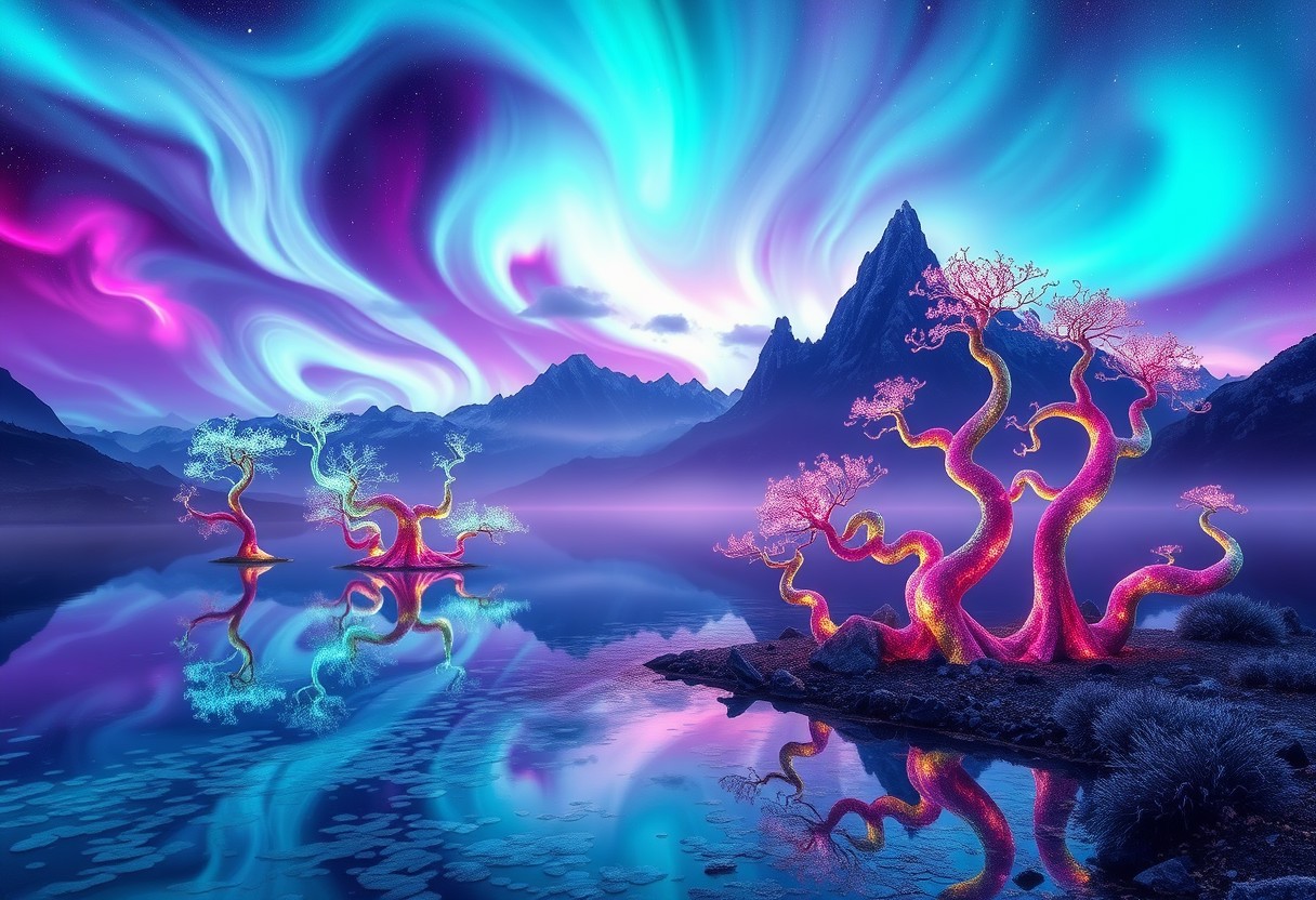 A breathtaking scene of a surreal landscape that blends the beauty of nature with abstract, dreamlike elements. The foreground features a crystal-clear, reflective lake that mirrors a sky filled with vibrant, swirling auroras in shades of purple, blue, and green. On the shore of the lake, unusual, glowing trees with twisted, spiraling branches reach out towards the heavens, their leaves shimmering in a spectrum of colors. In the distance, towering, otherworldly mountains with jagged peaks rise into the sky, partially obscured by wisps of ethereal mist. The entire scene is bathed in a soft, glowing light that enhances the vivid colors and gives the image a mystical, almost otherworldly feel. The horizon is a mix of deep purples and blues, creating a sense of infinite depth and wonder
