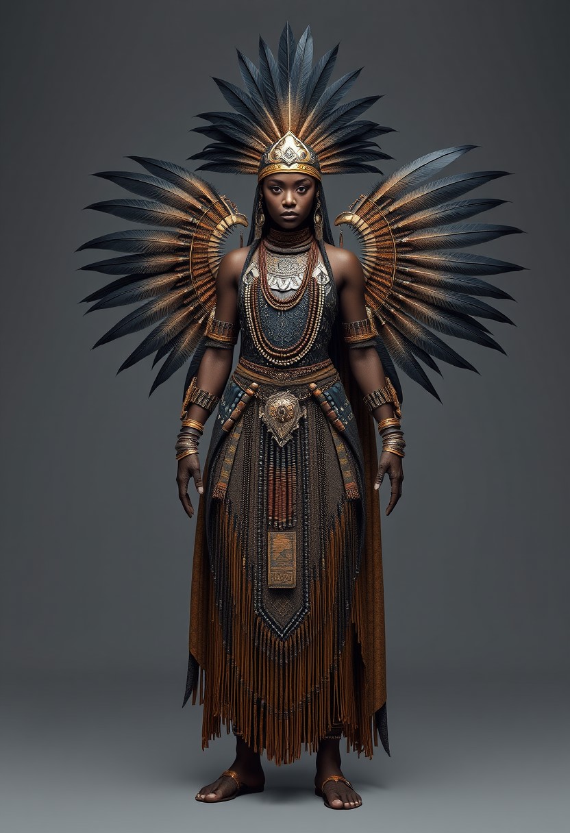 ultra realistic full body costume design and character design of an african tribal warrior queen + feather headdress + ultra detailed accessories + long cape + a lot of tribal necklaces, photographic style, 8k, octane render, studio grey background